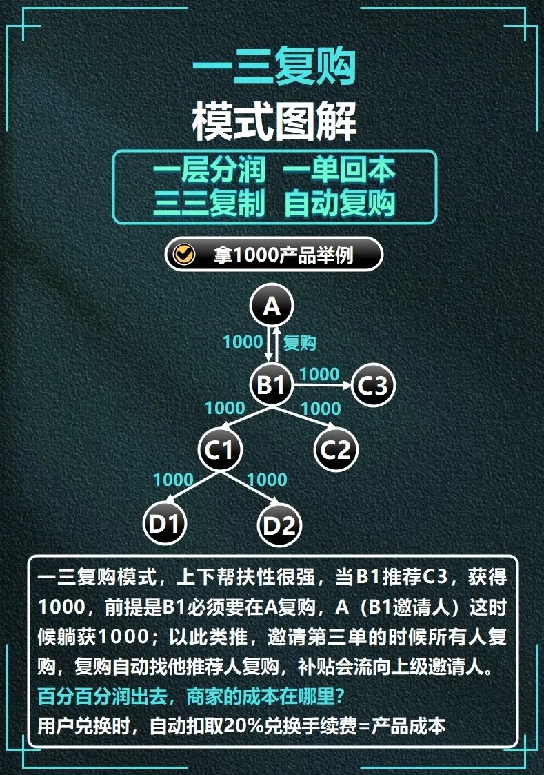 一三超级复购模式是一种结合消费复购与团队奖励的电商模式,通过层级会员制度实现收益循环。以下是该模式的核心机制及开发要点: